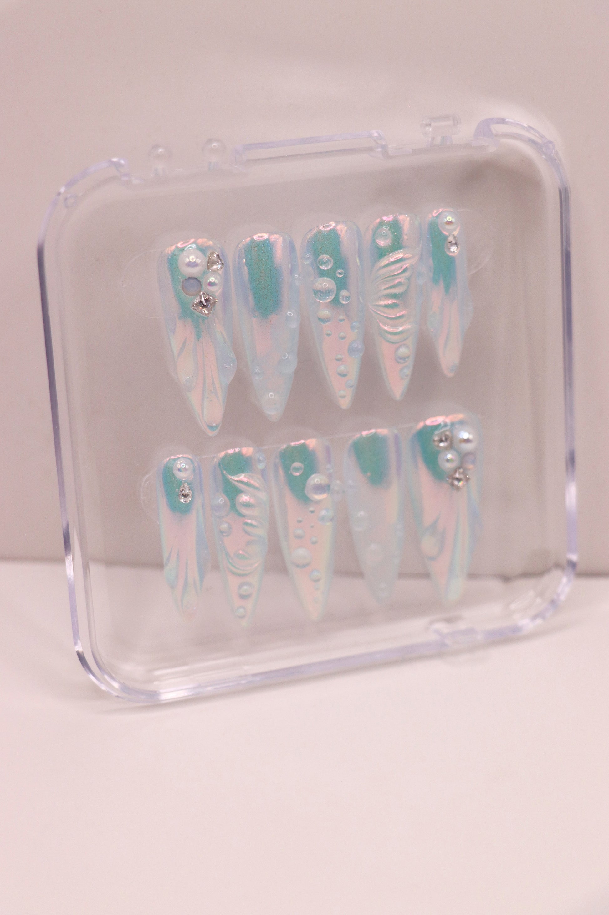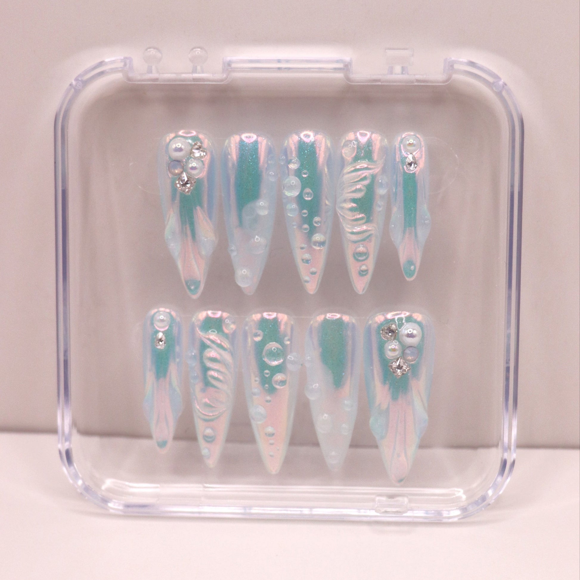 Make waves wherever you go with Aquamarine – a bold, beachy stiletto set that’s impossible to miss. These extra-long nails feature a dazzling pearl chrome finish, 3D bubble accents, and ocean-inspired textures with shimmer and shine from every angle.