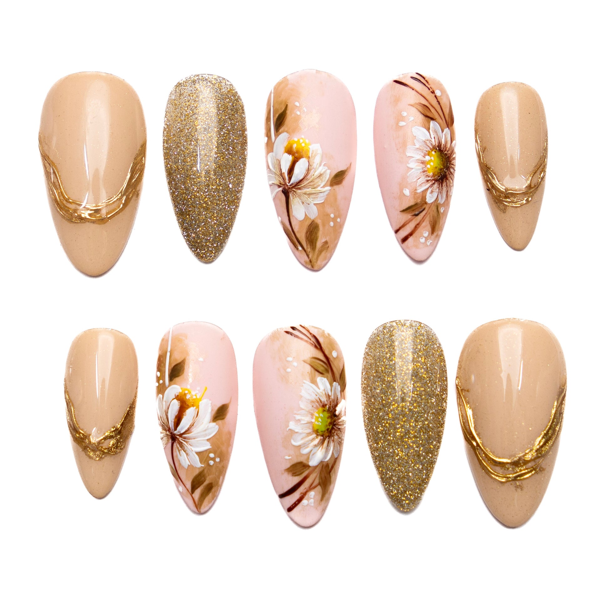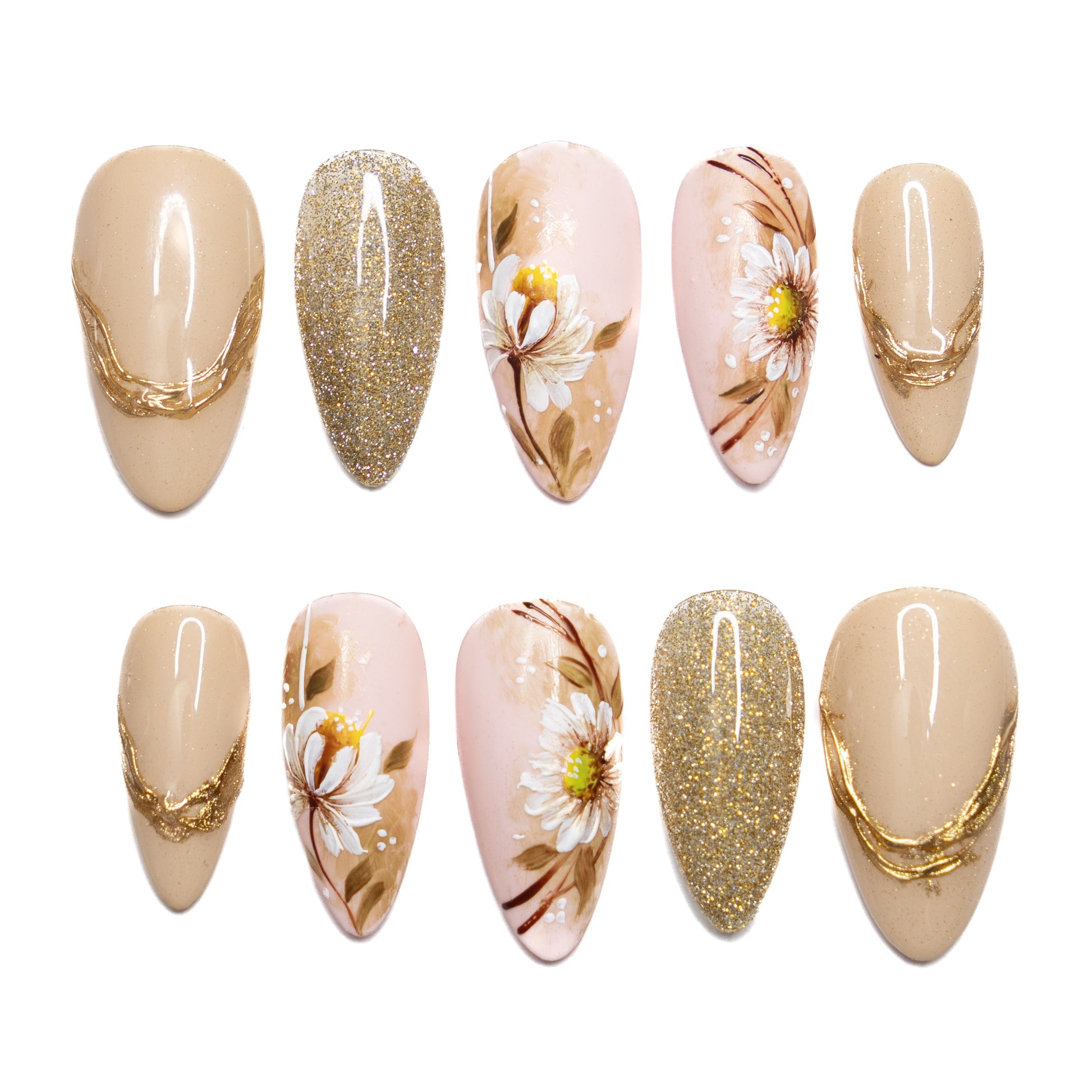 AURELIA is a medium almond press-on nail set inspired by soft floral and warm golden tones.