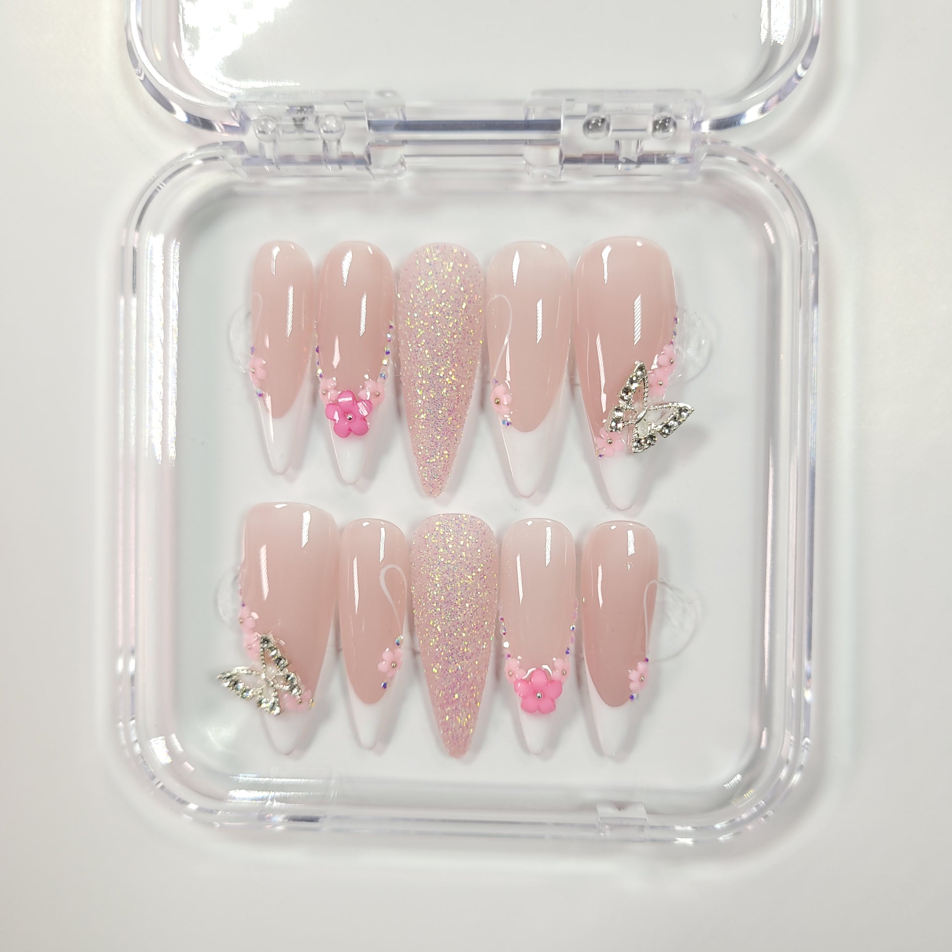 Embrace delicate elegance with this refined nail set, featuring a natural base paired with classic white French tips. Soft line art graces the nails, while charming blossoms and butterfly accents add a floral touch. The sugaring pink glitter adds a subtle sparkle, making this set a perfect blend of sophistication and graceful beauty.