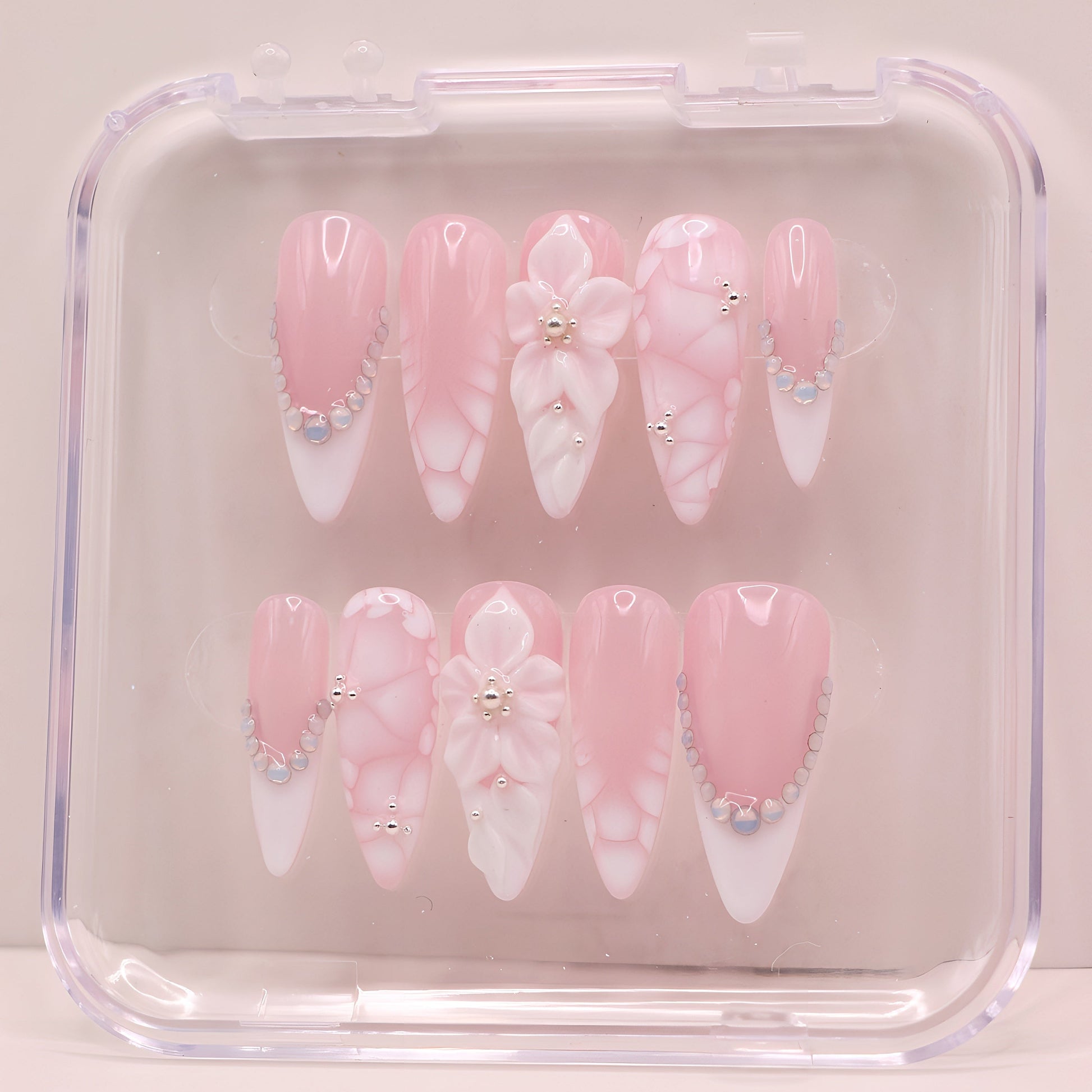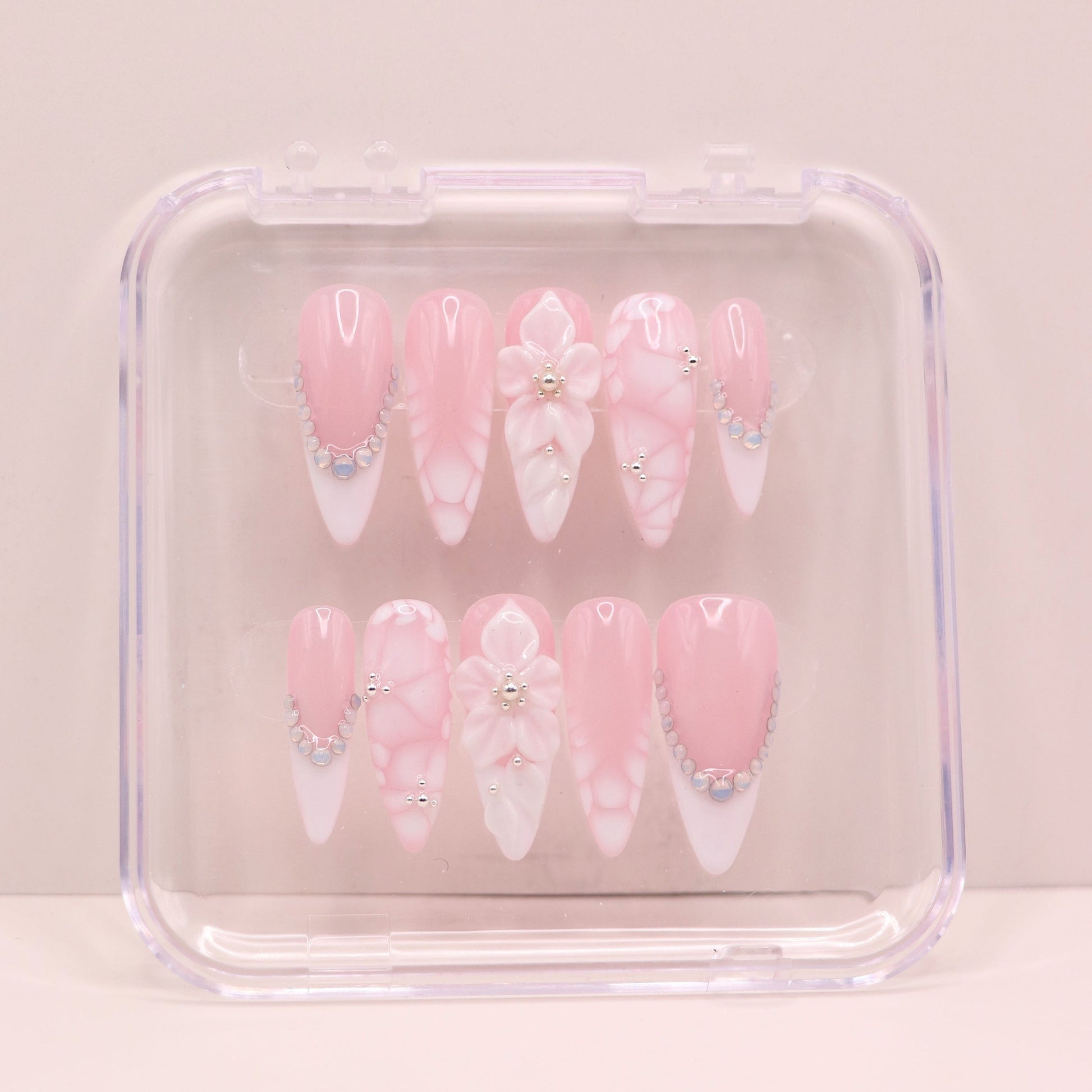 Floral Frost blends timeless elegance with a touch of glamour, featuring almond-shaped nails with blooming gel French tips, 3D crystal accents, and delicate floral details. Ideal for weddings, romantic dates, or spring celebrations, this set adds a graceful, luxurious finish to any look.