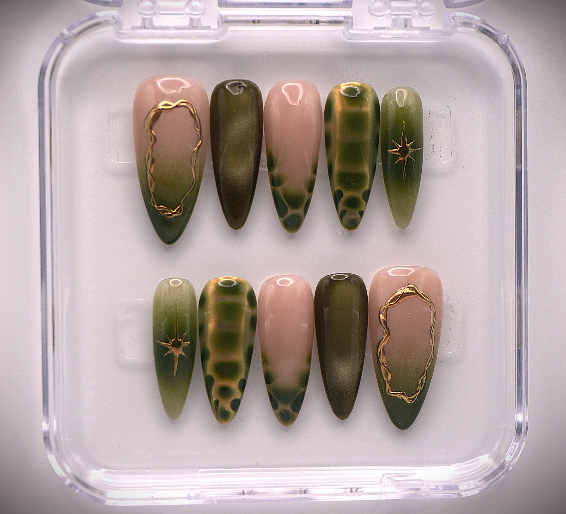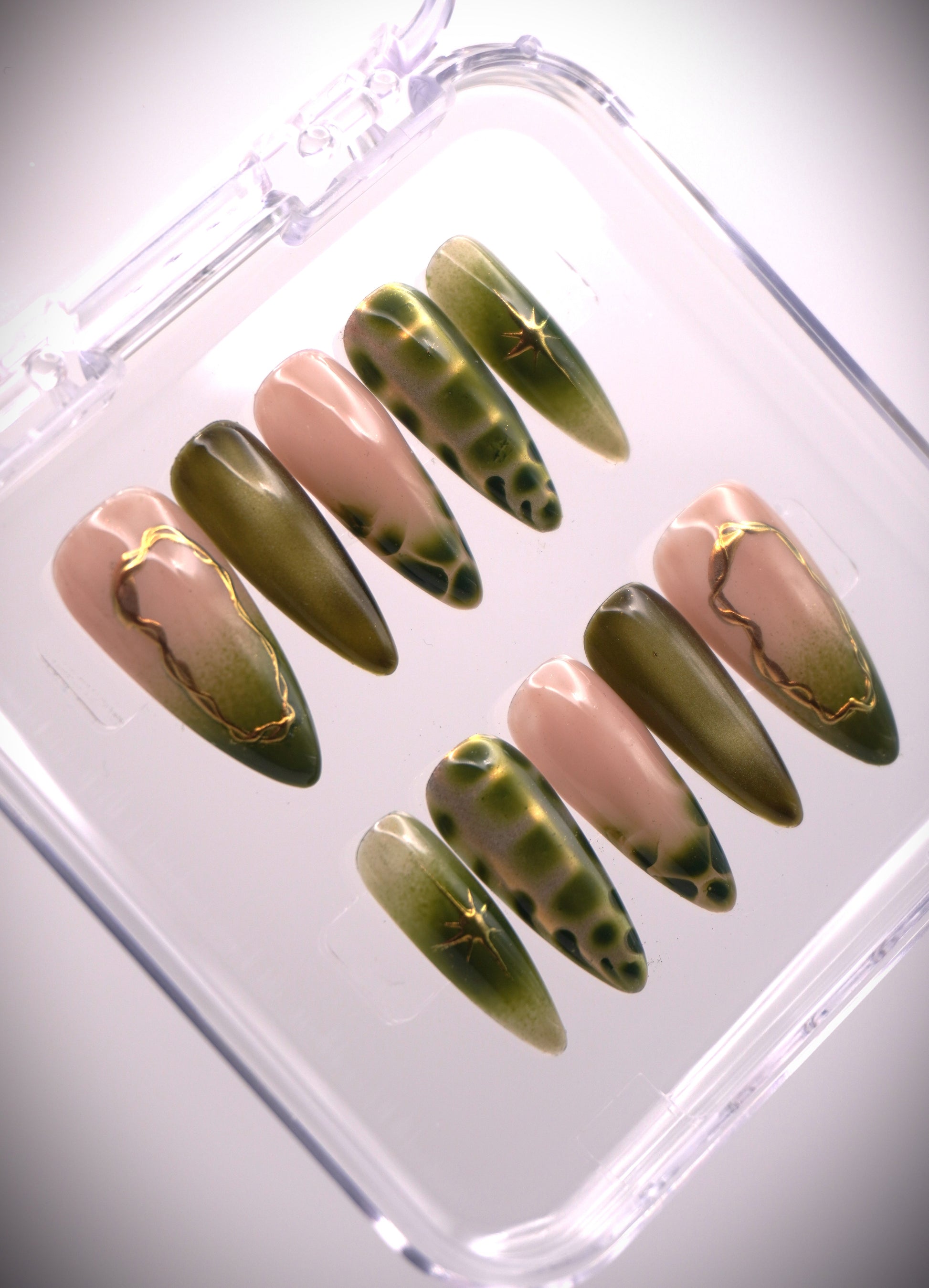 A stunning nail set that blends nature-inspired elegance with a modern edge. This design features rich jelly green and jade green tones, enhanced with green cat-eye gel for a mesmerizing, luminous effect. Using the ombre technique, the colors smoothly transition to create depth and dimension, while subtle chrome accents and fine gold details add a luxurious finish. Perfect for those who love a mix of earthy beauty and glamorous sophistication!