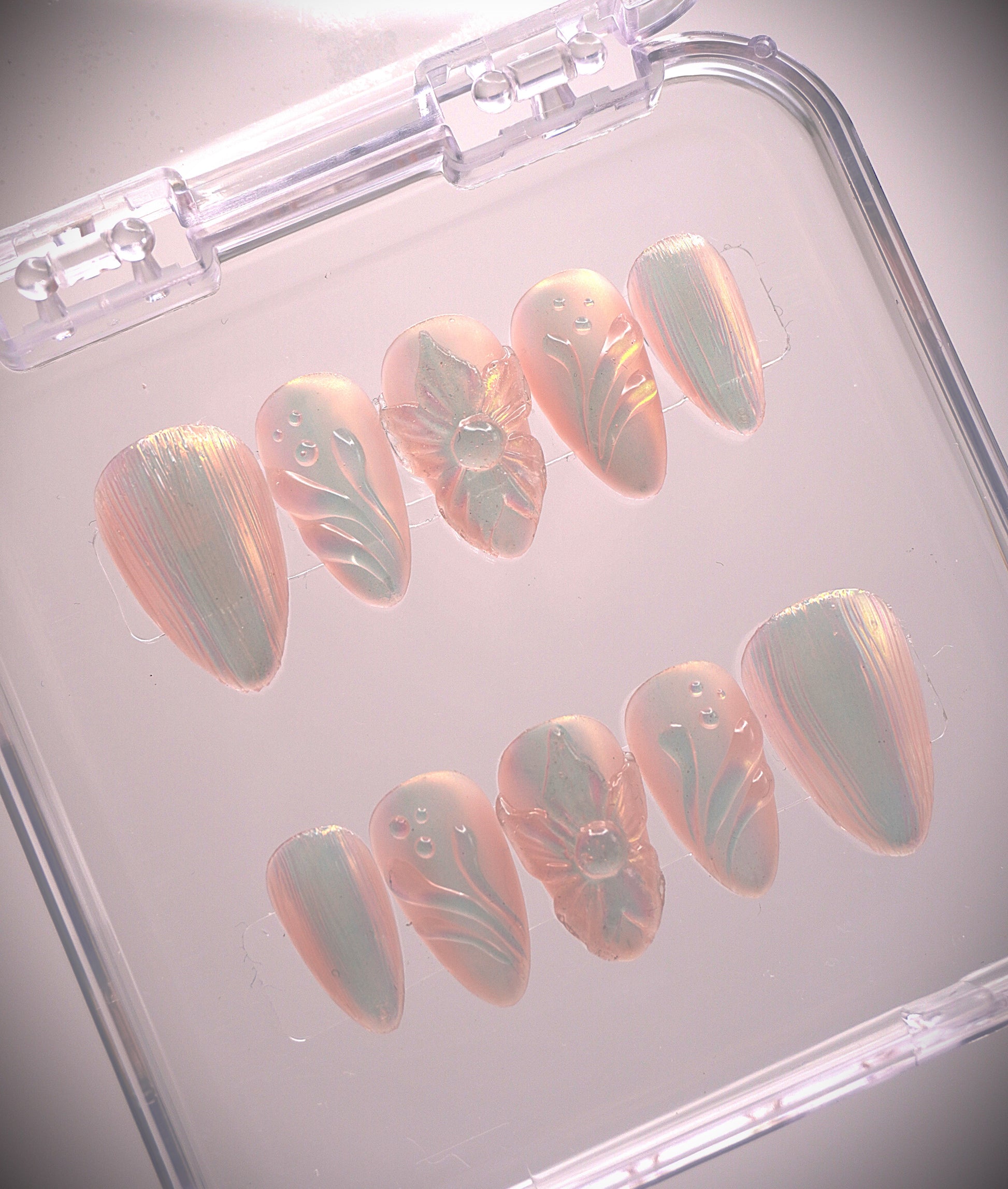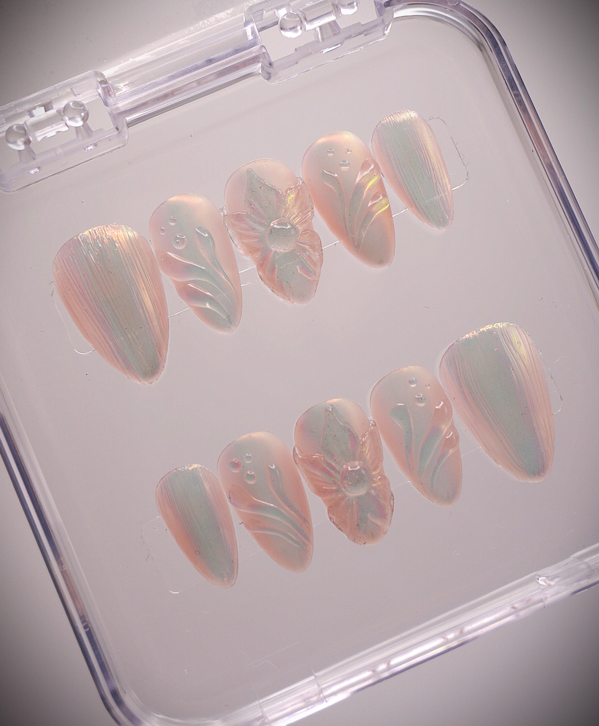 An idea that combines jelly 3D gel with aurora sunset chrome. Each piece evokes the soft beauty of translucent petals kissed by warm golden light. The 3D gel creates a rich, dimensional effect, while the aurora sunset chrome reflects captivating colors, offering a perfect blend of playfulness and radiant beauty.