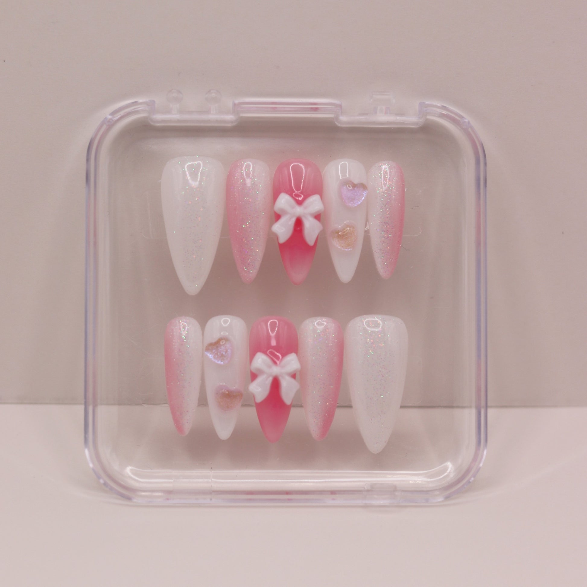 Embrace your inner romantic with Lover Girl, a delicate press-on nail set that sparkles with soft pink and white ombre, iridescent glitter, charming 3D bows, and dainty heart accents. Perfect for adding a touch of whimsy and sweetness to any look!