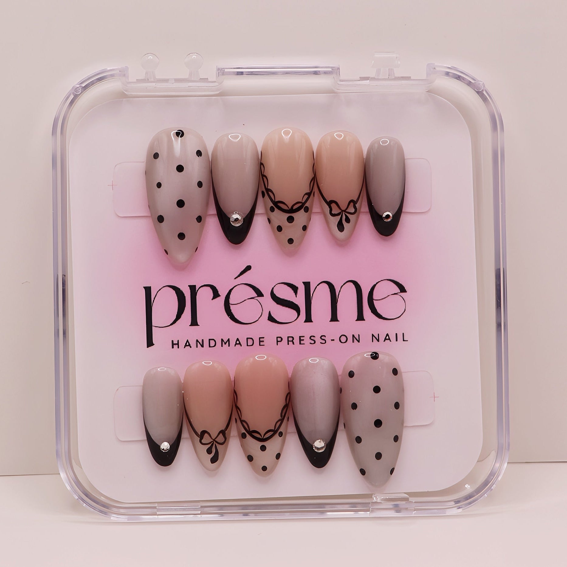 Inspired by Parisian sophistication, Noir Bow combines nude and taupe tones with black polka dots and delicate bow lines — creating the ultimate “quiet luxury” nail look.