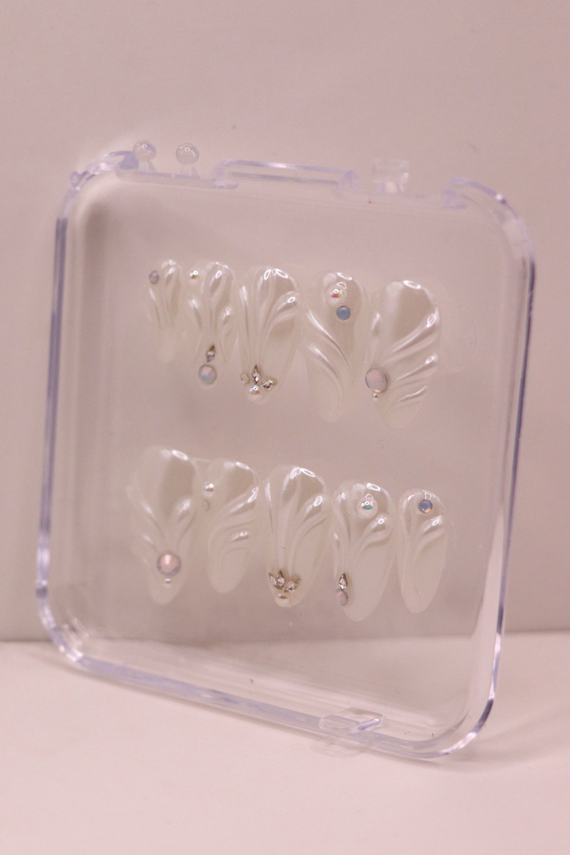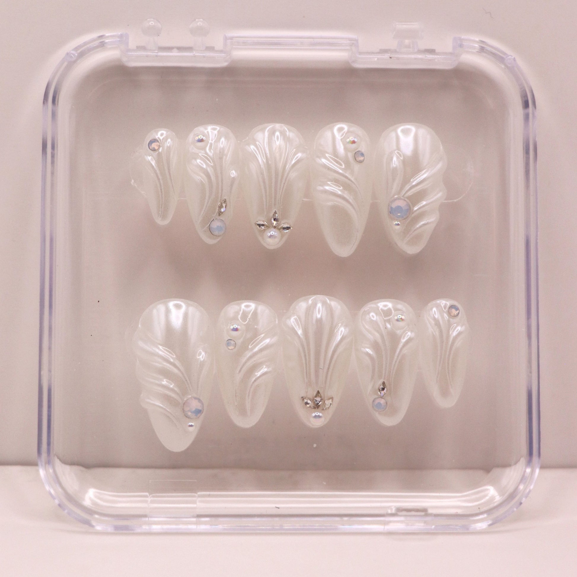 Add a touch of luxury to your everyday with our Opal Dream set. These oval-shaped nails feature a luminous pearl shimmer, enhanced by hand-sculpted 3D wave accents and delicate crystal embellishments for a soft, radiant glow. Ideal for 2025 brides, bridal parties, or anyone who loves a bit of glam, this set also looks stunning against sun-kissed skin—perfect for weddings, events, or elevating your daily style.