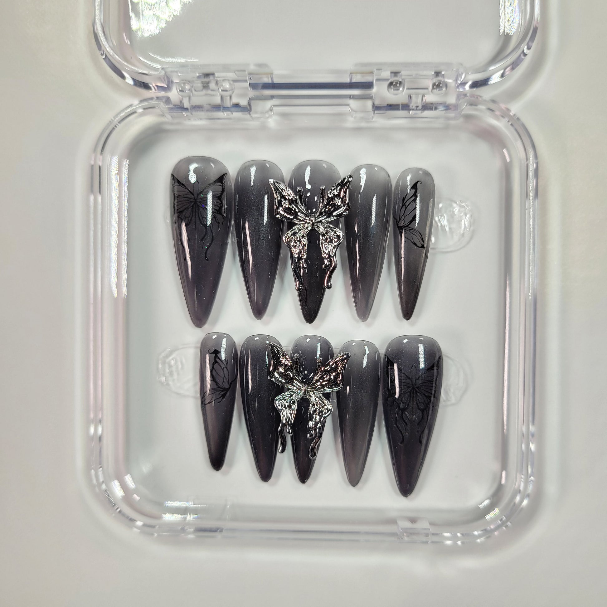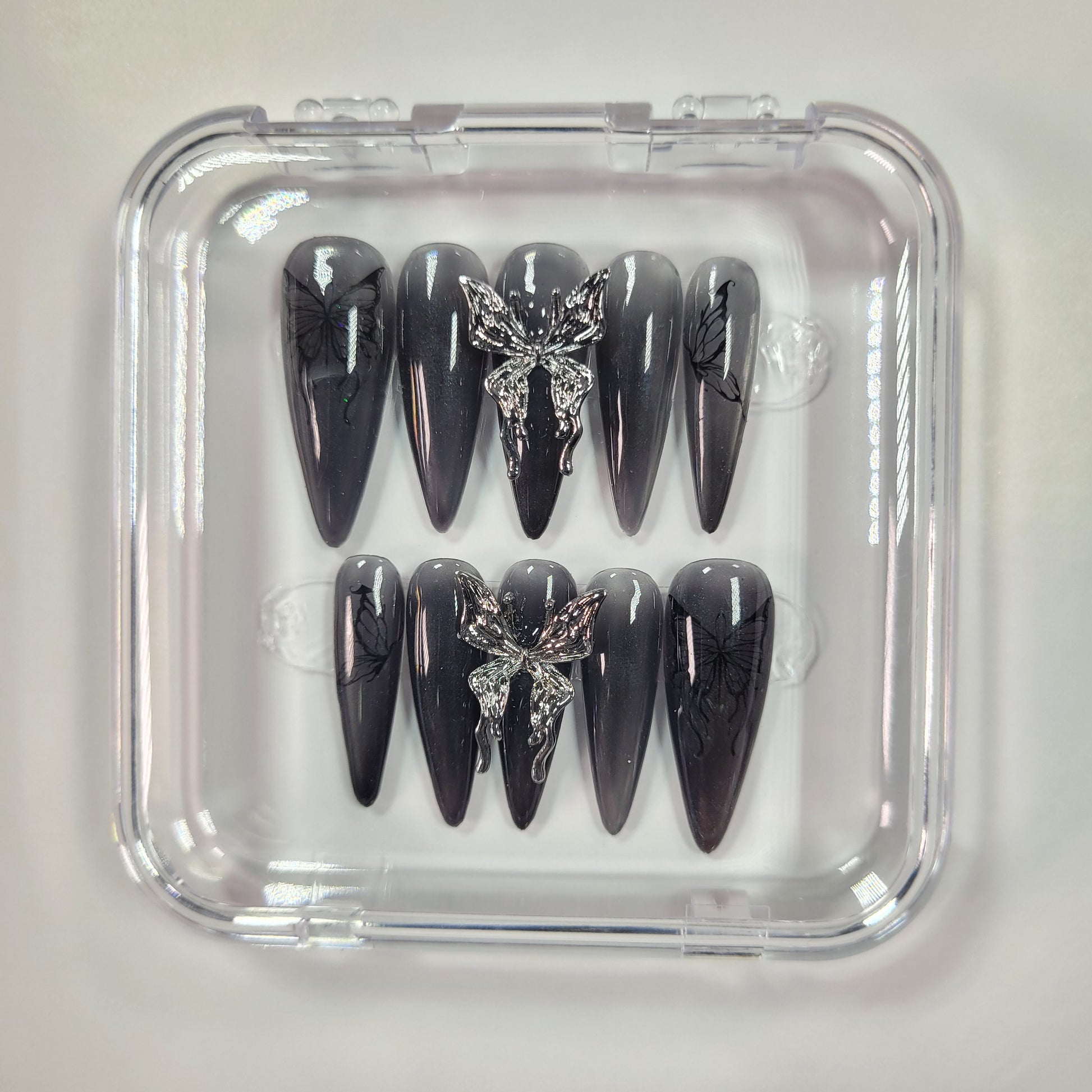 Transform your nails with the Black Butterfly press-on nail set, featuring a stunning design crafted with black syrup gel polish. Adorned with elegant black butterfly stickers and a charming butterfly charm, this set offers a chic and sophisticated look perfect for any occasion.