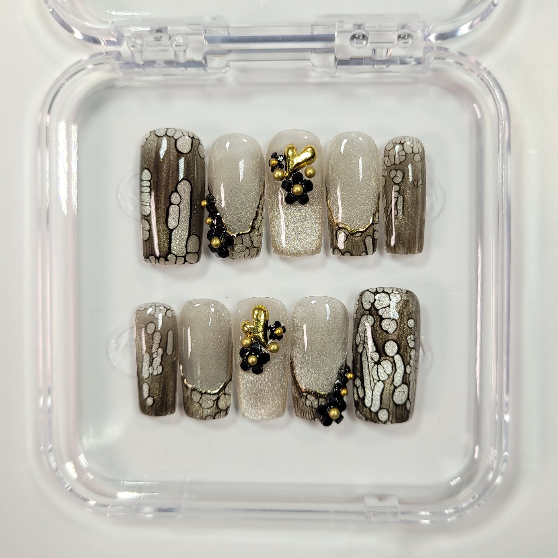 Midnight Bloom – Elevate your look for any party or night out with this glamorous nail set. Crafted with cat eye gel and abstract gel, it features high-quality nail decals and dazzling rhinestones, perfect for making a bold and sophisticated statement.