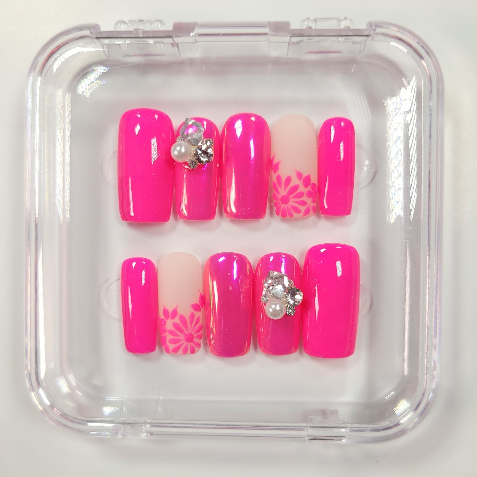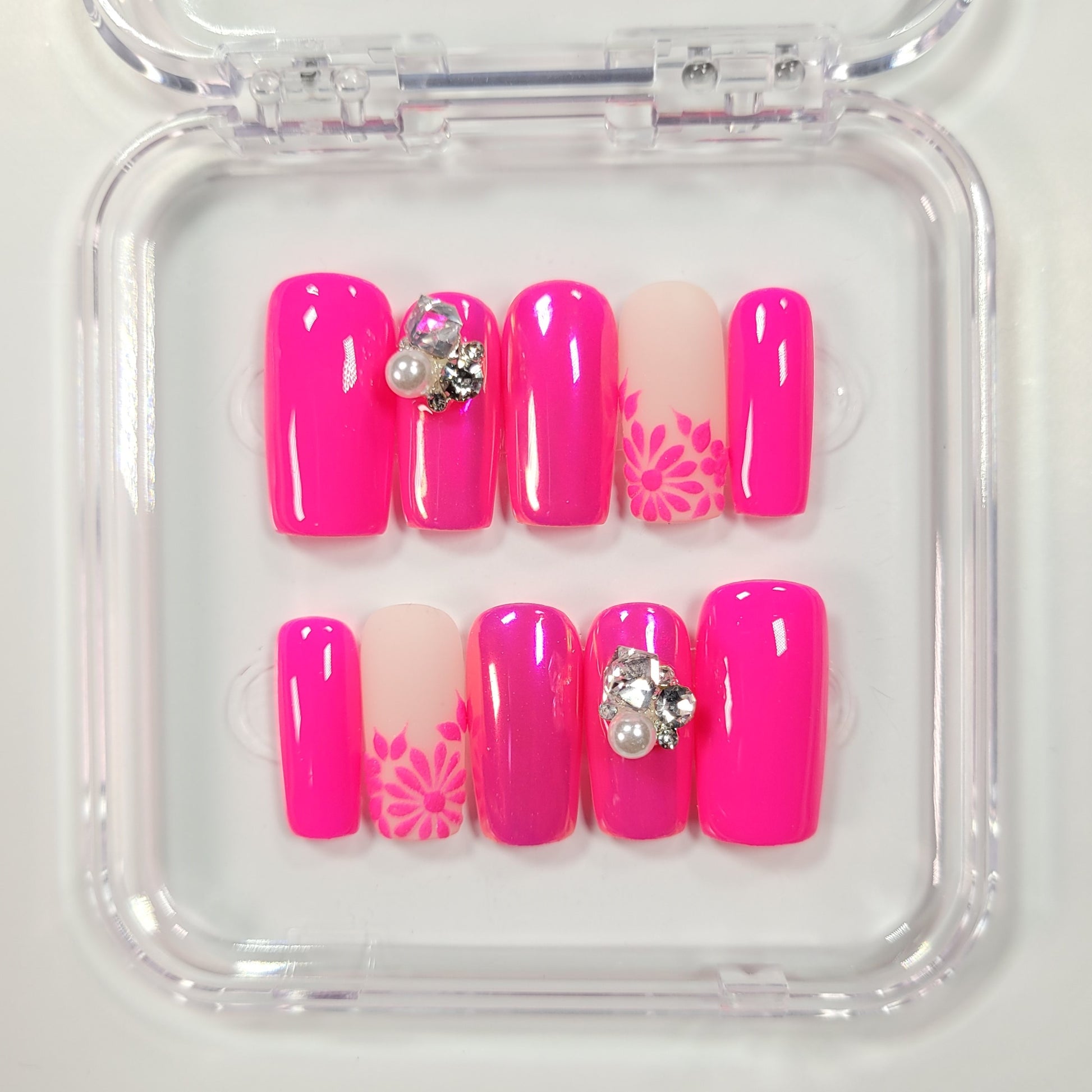 Embrace elegance with the Daisy Dream nail set, featuring stunning chrome and 3D textured flower designs. Adorned with shimmering rhinestones, this set brings a touch of sophistication and charm to your nails, perfect for any occasion.