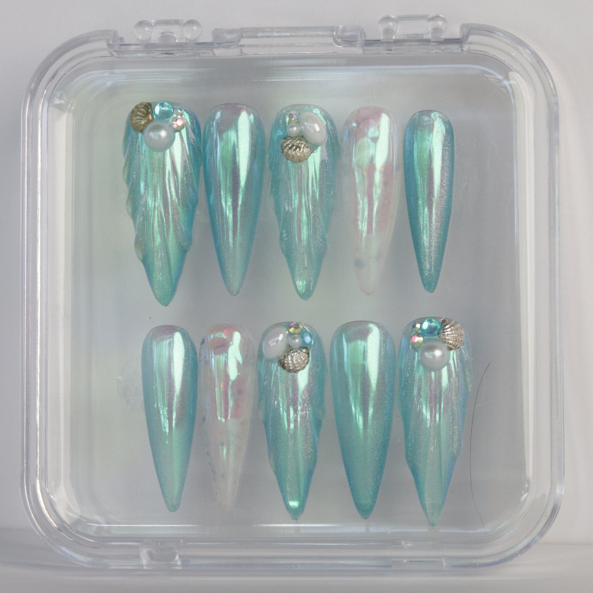 Ocean Glow – Immerse yourself in oceanic beauty with this stunning nail set. Crafted with cat eye gel and chrome powder using advanced 3D techniques, it creates a captivating ocean look. Enhanced with sparkling accents and high-quality rhinestones, it radiates a true ocean vibe.