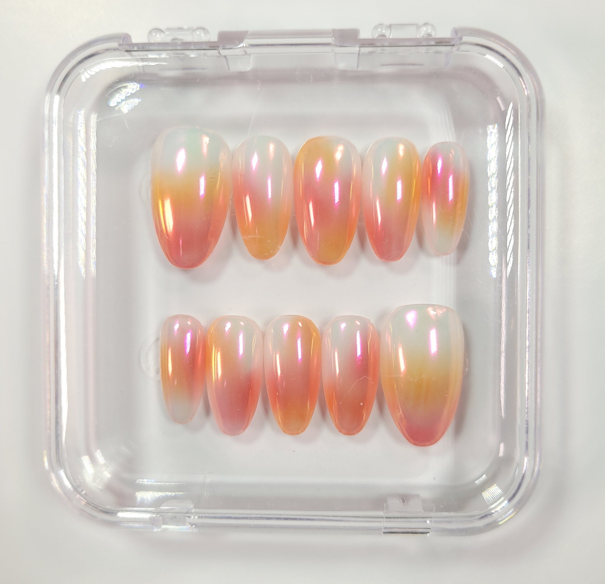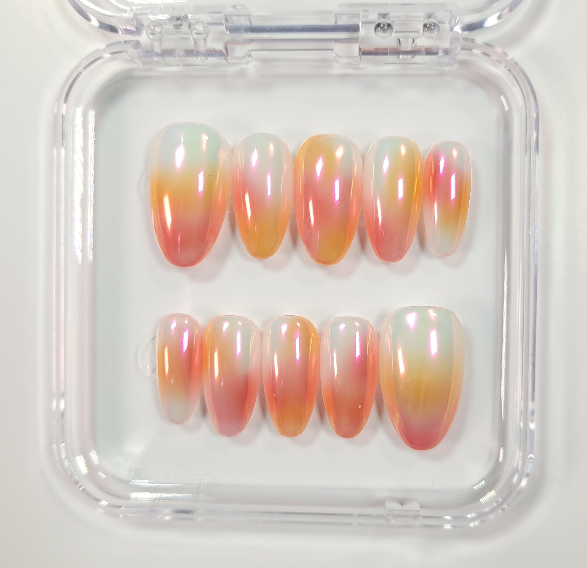Sunset Glow – Capture the essence of a tropical escape with this vibrant nail set. Featuring an ombre effect and aurora chrome powder, it embodies Malibu style with a perfect blend of sunset hues. Ideal for vacations, sunset views, and coastal parties.