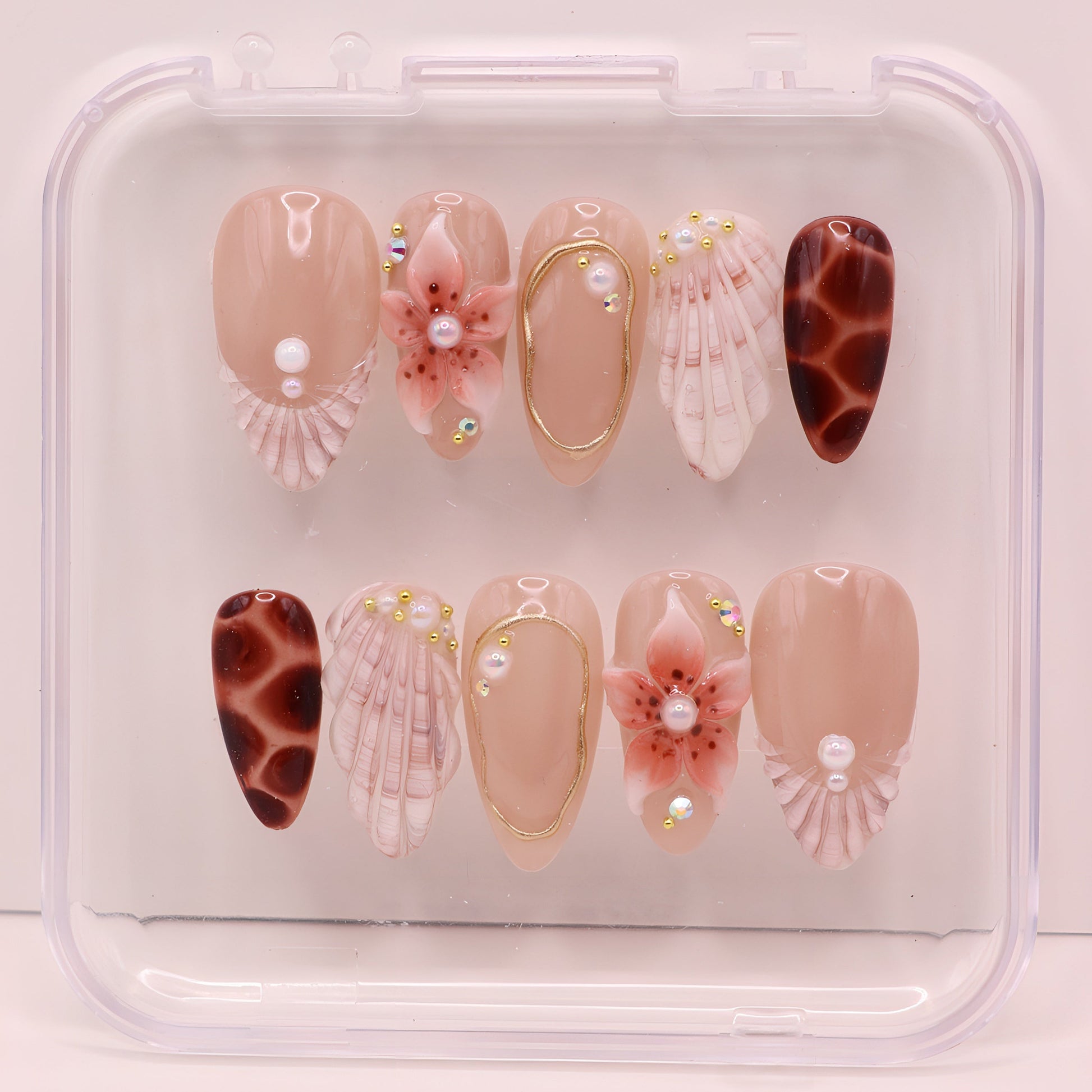 Soleil is the ultimate cool-girl set for your next vacation. Designed in chic neutral tones, this set features hand-crafted 3D seashell textures, floral decals, luxe pearl accents, and hints of gold foil detailing — all sealed in an ultra-glossy top coat for maximum shine.