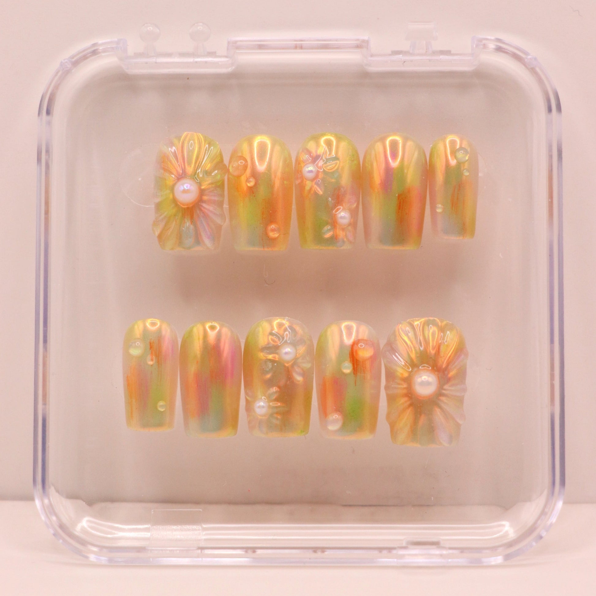 Bring the sunshine wherever you go with our Sunset Sorbet set! Featuring a vibrant ombré blend of yellow, orange, pink, and lime green, this square-shaped design is accented with 3D raindrops and hand-crafted sunflowers. It’s the perfect set for spring and summer, combining bold, cheerful colors with a natural, wearable length—ideal for vacations, sunny days, and confident, playful styles.