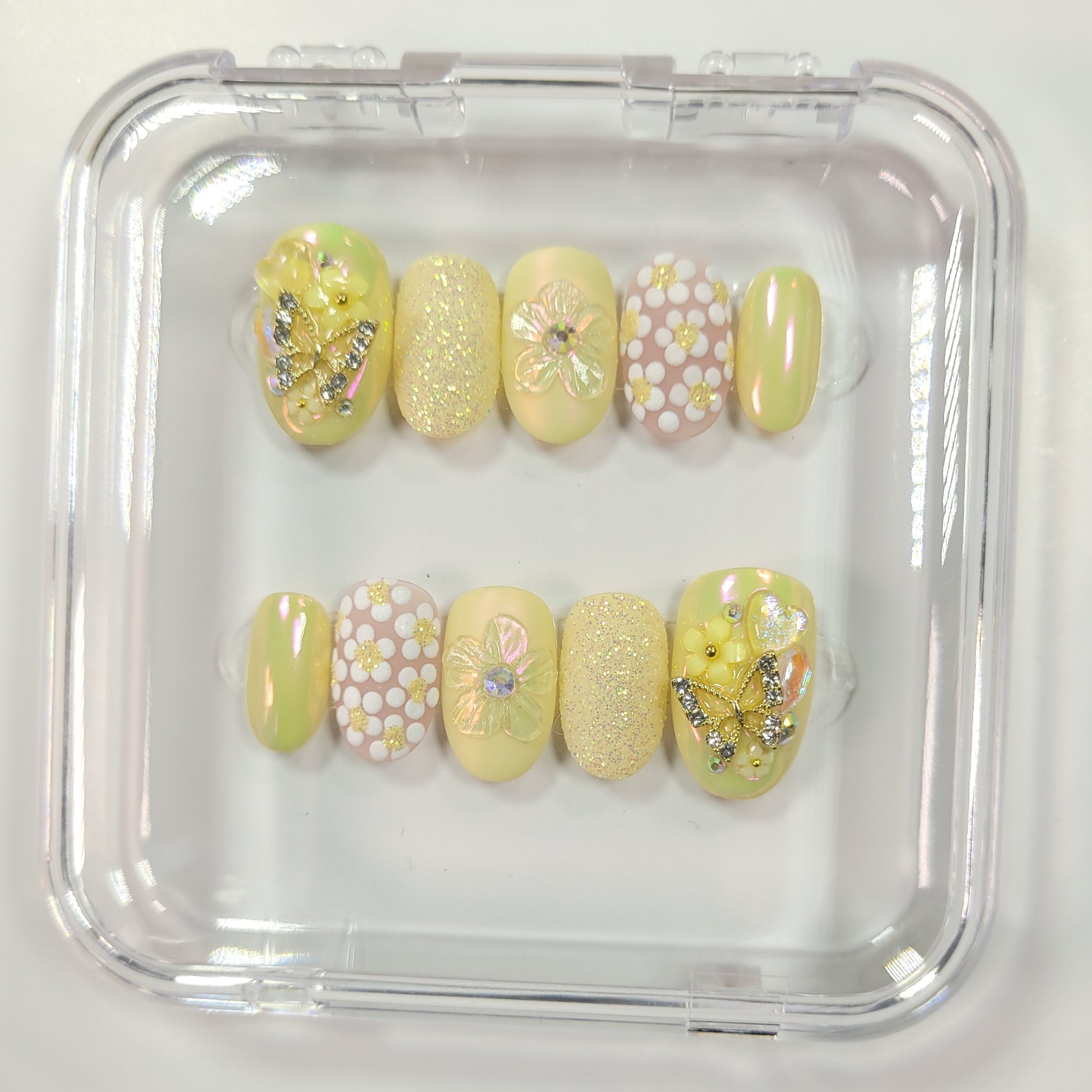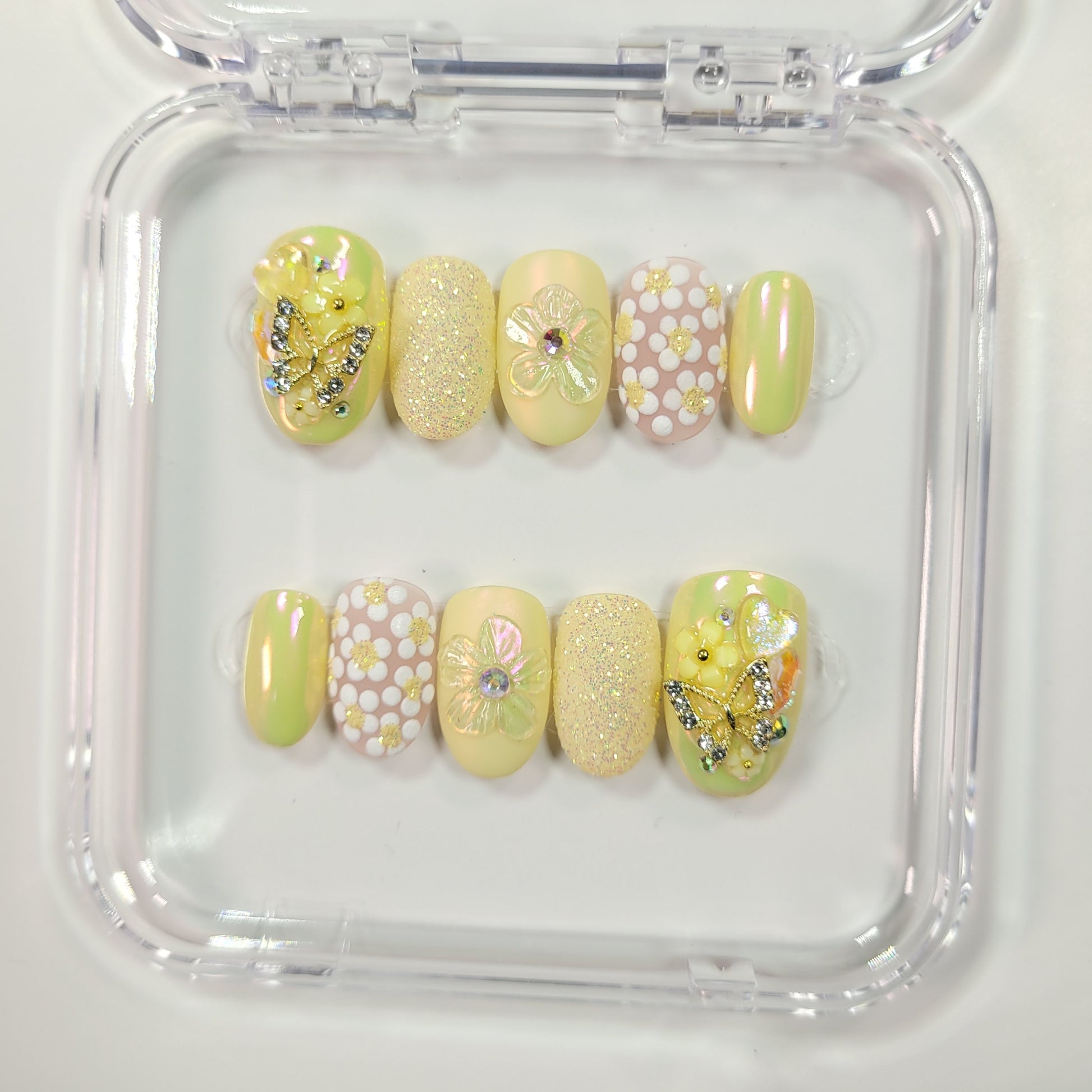 Step into a blooming paradise with the Sunshine Garden nail set, featuring a creamy yellow base adorned with white daisies and garden-style nail charms. The set includes a 3D gel design, chameleon chrome, and sugaring sparkle for a radiant and enchanting look.