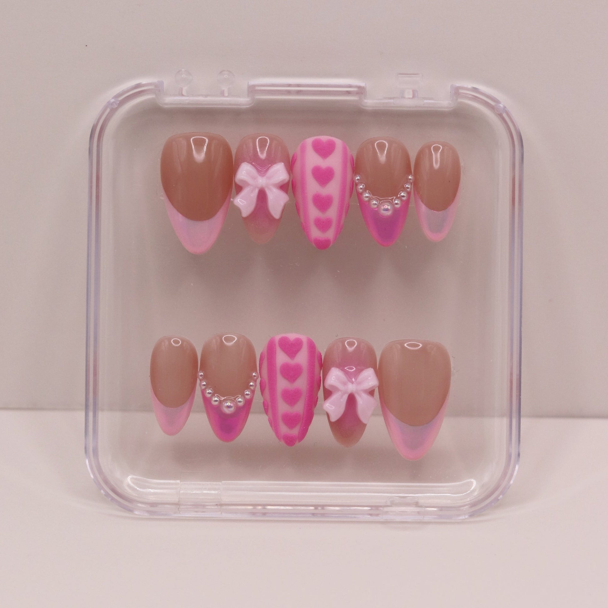 Turn up the charm with Sweet Talk, a playful press-on nail set designed for lovers of all things sweet and stylish. Featuring a soft nude base with pink French tips, dainty pearls, adorable 3D bows, and a bold heart-patterned accent nail, this set is perfect for adding a touch of romance and fun to your look!
