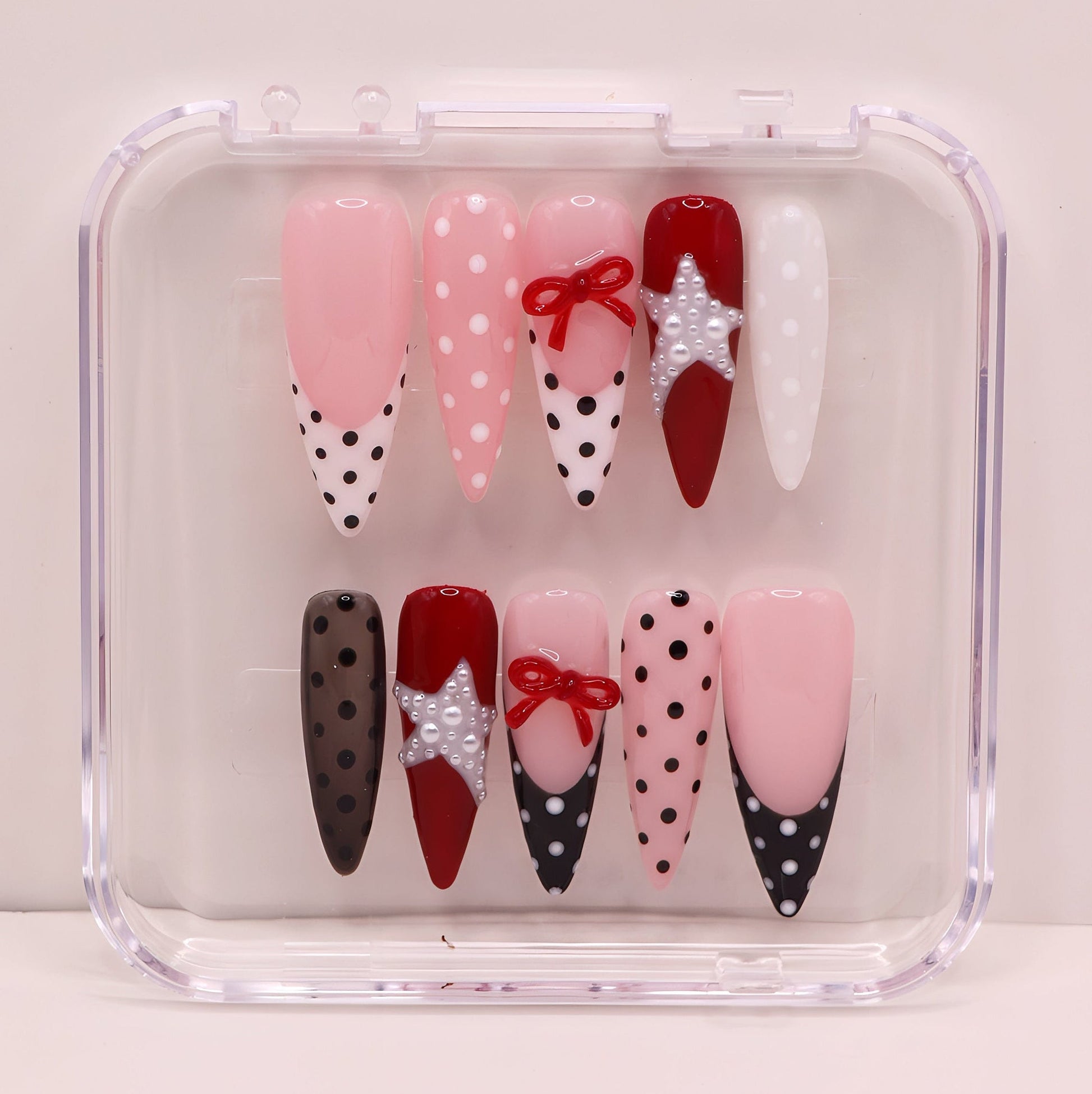 A modern twist on a playful classic. Polka Pop blends soft reds, deep reds, and timeless black-and-white polka dots for a look that’s both nostalgic and polished. Finished with delicate 3D bow and pearl/star accents, this set captures the charm of Y2K style with a sophisticated edge. Perfect for those who love a bold, feminine statement.